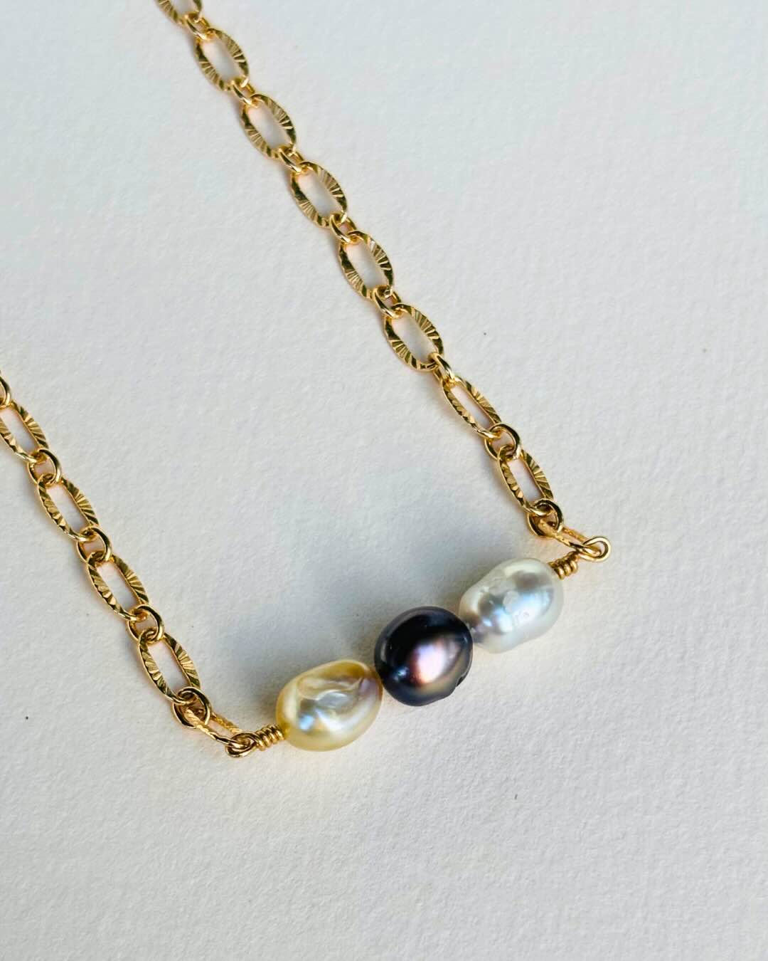 Un trio de 3 keshis aux superbes couleurs : doré, blanc et noir. Une face avec les keshis lisses et une face avec des aspérités sur le keshi blanc et des malformations sur les keshis noir et doré.