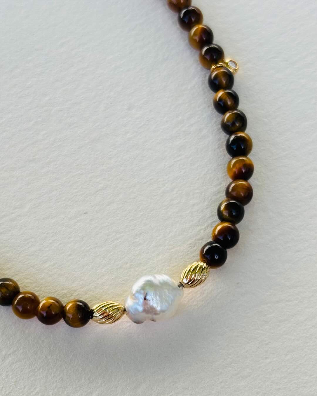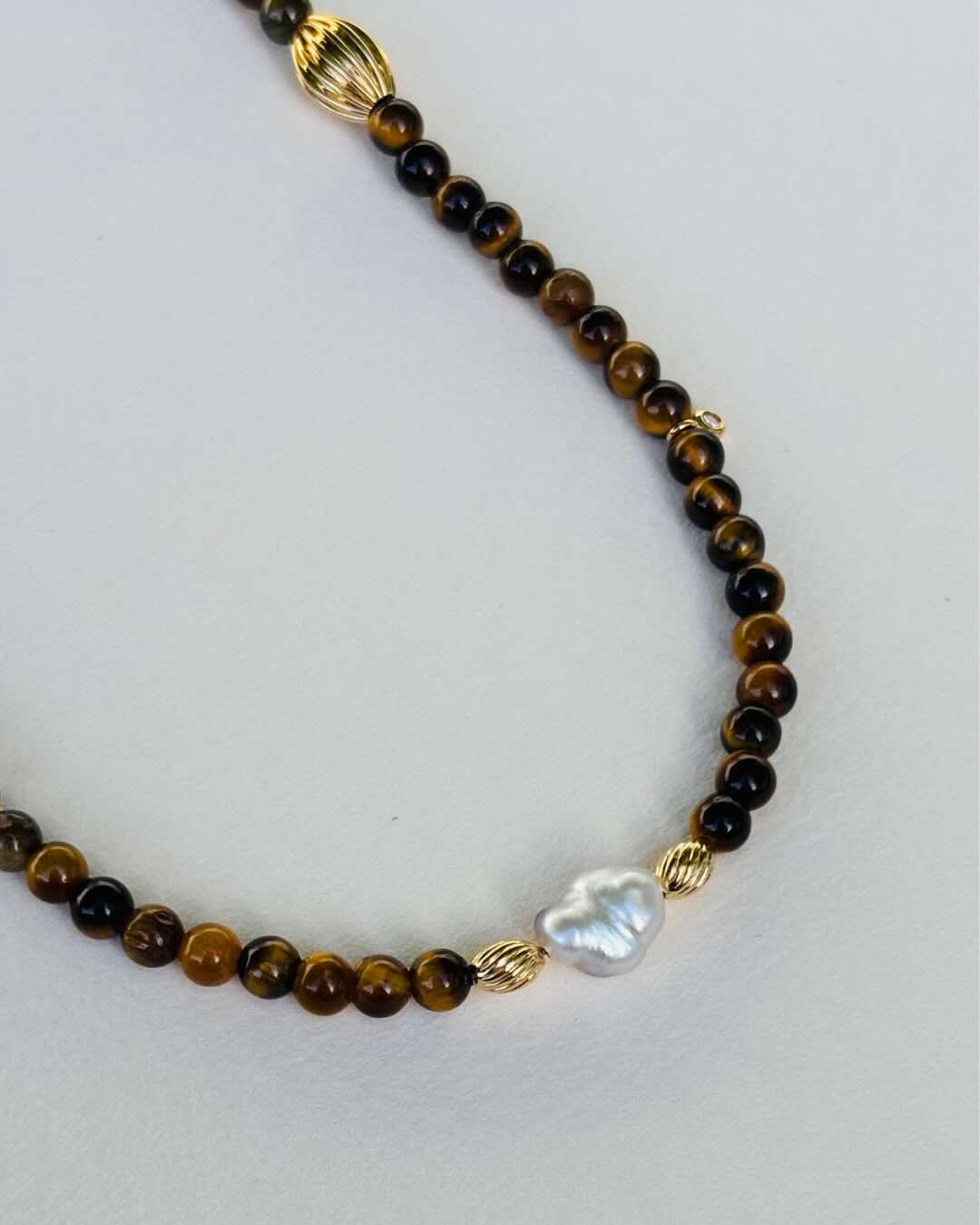Prix régulier €115,00Notre collier MOKA est composé d'une jolie perle keshi de Tahiti de forme baroque entourée de perles naturelles d'Oeil de tigre et ponctué de perles en plaqué or et de deux minis pendentifs en zircons transparents qui apportent une touche de brillant supplémentaire à cette jolie création. Un bijou bohème-chic pour ajouter une touche d'exotisme à toutes vos tenues.