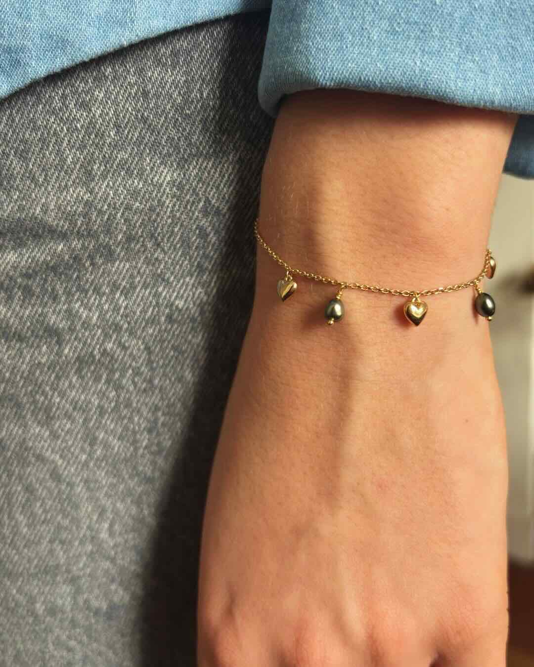 Ce bracelet délicat se compose d’une chaîne fine en plaqué or 18 carats venant habiller votre poignet. Il est rythmé par une pluie de pampilles où se mêlent trois petits cœurs symboliques et deux mini perles Keshi de Tahiti aux nuances foncées et mystérieuses.